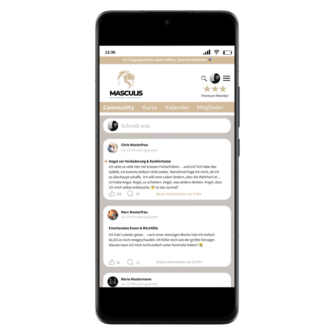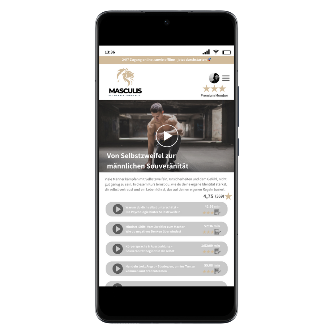 💡 Masculis ist mehr als eine Community – es ist dein Schlüssel zu echter Veränderung. Hier bekommst du Zugang zu Wissen, Mentoring und einer starken Gemeinschaft, die dich auf deinem Weg unterstützt.